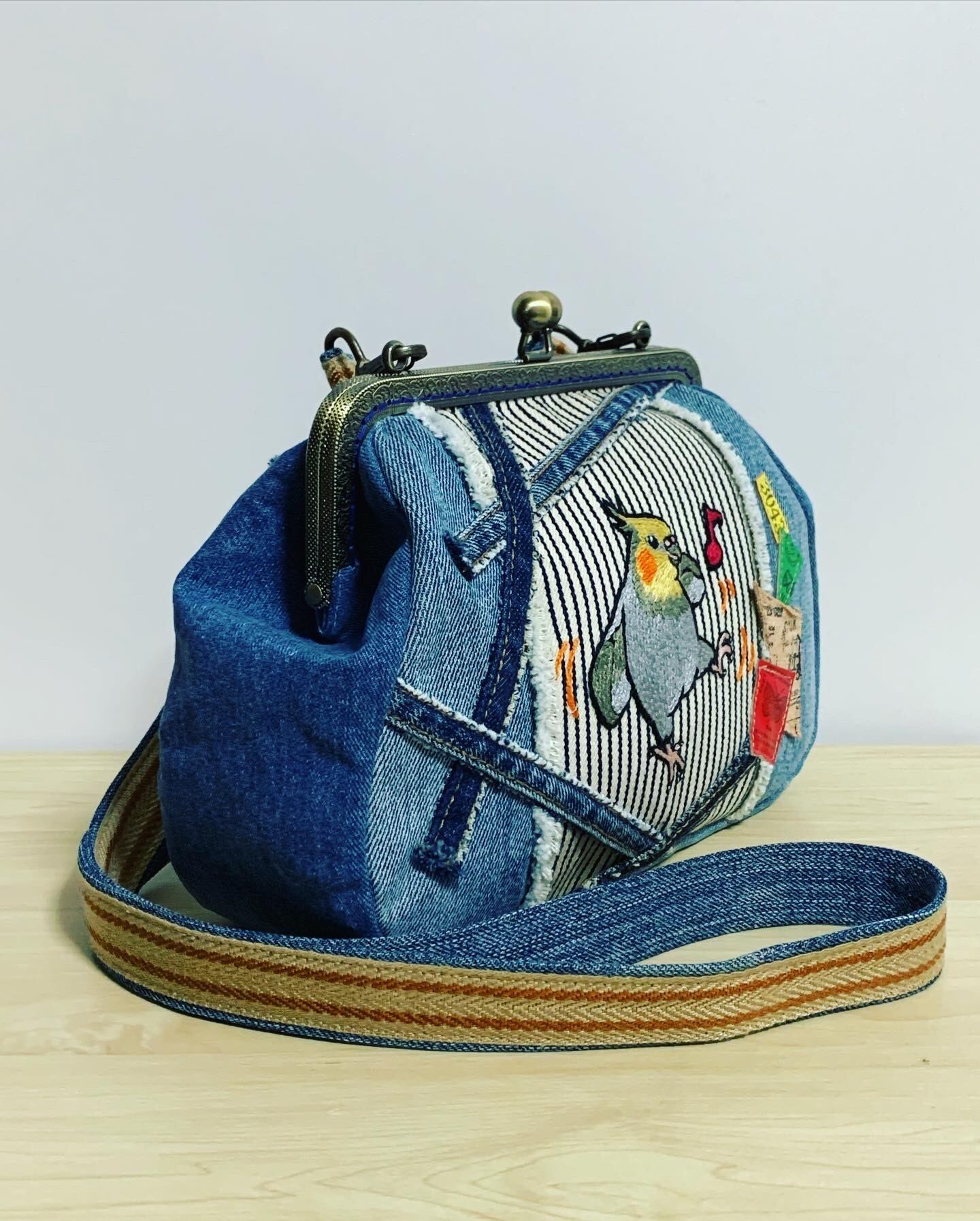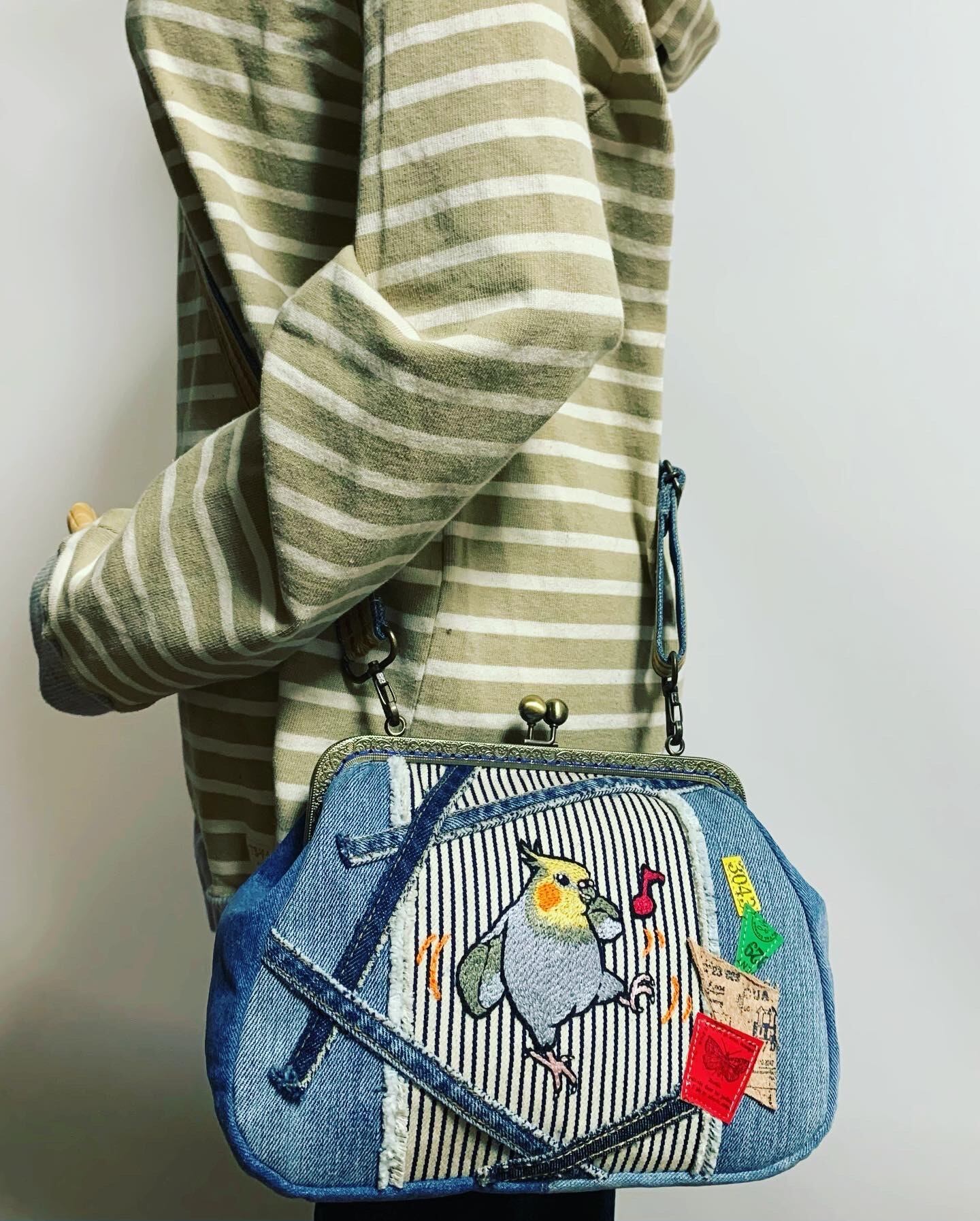 手刺繍:オカメさんのノリノリ♪ダンス★がま口ショルダーバッグ♪