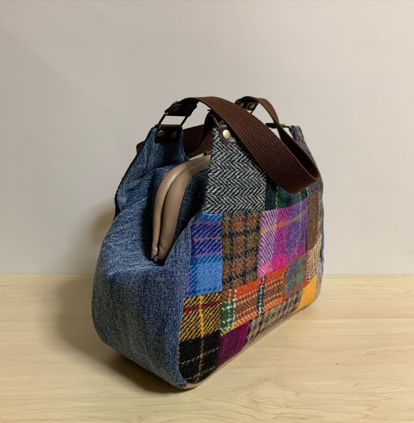 ハリスツイードパッチの★バネ口金ハンドバッグ♪
